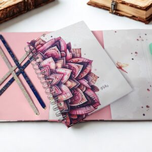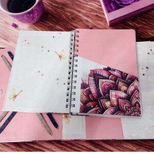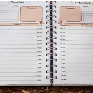 Outra com um planner com 110 folhas em papel 90 grs, removível para que possa trocar por outro quando terminar, com bolso triplo para que não perca papéis ou outros ítens pequenos.